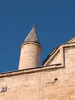 The mosque is a single-domed building, made entirely of stone, built on a square base. The mosque is built of limestone blocks of light-yellow colour and grainy structure. The blocks are of homogeneous material, making it unlikely that the blocks were taken from the old mosque or the Roman town of Abritus. All stones are perfectly polished and built in rows with a thin joint. Some of them are attached with iron clamps and soldered with lead – a preventive measure, used by the Ottomans to protect minarets during earthquakes. (It is believed that this feature of the mosque is the reason it withstood the 9 earthquakes in Romania between 1701 and 1997.) In addition, the masons reinforced the mortar by putting egg whites in it.[9] All façades end in height with a common narrow and elegant classical cornice. Three of them (except for the north-western façade) are based on a stone plinth. There are 45 windows on the four façades – on three of them there are 13 windows, and on the front façade, there are 6.