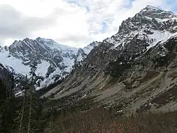 During the Pleistocene period dating back over two million years ago, glaciation advancing and retreating repeatedly scoured the landscape leaving deposits of rock debris.[3] The U-shaped cross section of the river valleys is a result of recent glaciation. Uplift and faulting in combination with glaciation have been the dominant processes which have created the tall peaks and deep valleys of the North Cascades area.