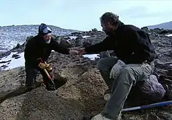 ![]() Screenshot of Allan Ashworth and Adam Lewis looking for fossils in the McMurdo Dry Valleys | |