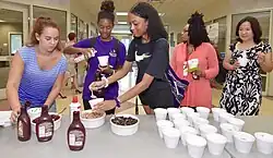 An ice cream social or ice cream sociable is an informal social event at which the main focus is the serving and eating of ice cream. Ice cream socials typically include multiple ice cream flavors and a variety of toppings such as syrups, whipped cream, and sprinkles for guests to choose from.[1][2] Such events often allow guests to assemble their own custom desserts or request specific ingredients from those serving them.[1][3] The event developed in the United States in the 19th century.[1]