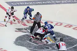 ![]() Exhibition game Amur Khabarovsk vs. Japanese national team on August 23, 2012. Face-off at the beginning of the game. Amur forwards Juha-Pekka Hytönen (at right) and Jakub Petružálek. | |