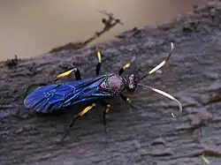 Ichneumon centrator is around 0.75 in (19 mm) long, with four wings that are described as violet or blue. The male and female wasps appear different.