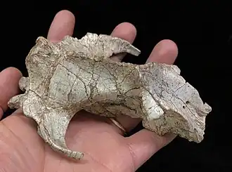 The astragalus bone, which is present in the ankle of artiodactyls and archaic whales that retained feet, has similar dimensions in both Eocene artiodactyls and Ichthyolestes.[5] In addition to lending evidence to the theory of a direct relationship between artiodactyls and cetaceans,[11] this knowledge has led to two competing hypotheses about the locomotion of Ichthyolestes and other pakicetids. The first states that Ichthyolestes and Pakicetus were terrestrial and cursorial, implying that aquatic locomotor adaptation occurred after the origin of Cetacea.[9][13] The second states that Ichthyolestes and Pakicetus were already semi-aquatic and cetaceans originated from an earlier unknown Eocene artiodactyl, such as Elomeryx[14][15] or Indohyus,[16][17] implying that aquatic locomotor adaptations occurred before or during the origin of Cetacea.[5]