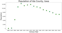 Ida County is a county located in the U.S. state of Iowa. As of the 2020 census the population was 7,005, making it the state's eighth-least populous county.[1] The county seat is Ida Grove.[2] The county was authorized by the Iowa Legislature in January 1851 as a packet of projected counties in unorganized territory of western Iowa. It was named after Ida Smith, the first child of European immigrants to be born in this region.[3]
