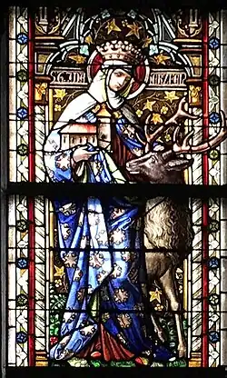 She is frequently depicted either as carrying a church or with a dove hovering over her head. During the 32-year war between the Saxons and the Franks, Ida extended her protection to the Saxons in their. The deer with which Ida is often portrayed represents the Saxons, who are besieged by the Franks. Even today the deer is in the coat of arms of Herzfeld.