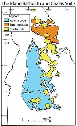 The Idaho Batholith is a granitic and granodioritic batholith of Cretaceous-Paleogene age that covers approximately 25,000 square kilometres (9,700 sq mi) of central Idaho and adjacent Montana. The batholith has two lobes that are separate from each other geographically and geologically. The Bitterroot lobe is the smaller lobe and the larger lobe is the Atlanta lobe. The Bitterroot lobe is in the north and is separated from the larger Atlanta lobe in the south by the Belt Supergroup metamorphic rocks that compose the Salmon River Arch.[1] Much of the Atlanta and Bitterroot lobes are in the Idaho Batholith ecoregion.[2]