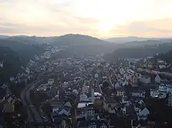 Idar-Oberstein (German: [ˌiːdaːɐ̯ ˈʔoːbɐˌʃtaɪn] ⓘ) is a town in the Birkenfeld district in Rhineland-Palatinate, Germany. As a Große kreisangehörige Stadt (large city belonging to a district), it assumes some of the responsibilities that for smaller municipalities in the district are assumed by the district administration. Today's town of Idar-Oberstein is the product of two rounds of administrative reform, one in 1933 and the other in 1969, which saw many municipalities amalgamated into one. The various Stadtteile have, however, retained their original identities, which, aside from the somewhat more urban character encountered in Idar and Oberstein, tend to hark back to each centre's history as a rural village. Idar-Oberstein is known as a gemstone town, and also as a garrison town. It is also the largest town in the Hunsrück.