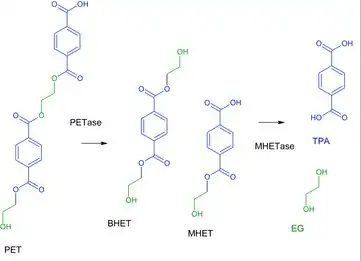 Ideonella sakaiensis adhere to PET surface and use a secreted PET hydrolase, or PETase, to degrade the PET into mono(2-hydroxyethyl)terephthalic acid (MHET), a heterodimer composed of terephthalic acid (TPA) and ethylene glycol. The PETase also degrades PET into another intermediate known as Bis-(2-hydroxyethyl) terephthalate (BHET), BHET can be converted into MHET after PET hydrolysis.[4] The I. sakaiensis PETase functions by hydrolyzing the ester bonds present in PET with high specificity. The resulting MHET is then degraded into its two monomeric constituents by a lipid-anchored MHET hydrolase enzyme, or MHETase, on the cell's outer membrane.[1] The overall mechanism of the PET plastic being broken down is exhibited in the image above. The monomeric constituents such as ethylene glycol is then taken up and used by I. sakaiensis and many other bacteria.[1][5] The other constituent; terephthalic acid, a more recalcitrant compound, is imported into the I. sakaiensis cell via the terephthalic acid transporter protein. Once in the cell, the aromatic terephthalic acid molecule is oxidized by terephthalic acid-1,2-dioxygenase and 1,2-dihydroxy-3,5-cyclohexadiene-1,4-dicarboxylate dehydrogenase into a catechol intermediate. The catechol ring is then cleaved by PCA 3,4-dioxygenase before the compound is integrated into other metabolic pathways (e.g. TCA cycle).[1] As a result, both of the molecules derived from the PET are used by the cell to produce energy and to build necessary biomolecules. Eventually, the assimilated carbon may be mineralized to carbon dioxide and released into the atmosphere.[1]