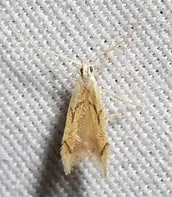 The wingspan is about 10 mm.[4] There are two or three generations per year. The larvae feed on Dichanthelium clandestinum. They skeletonize the leaves of their host plant.[5]