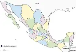 The type series comprised a female holotype and four male paratypes, all collected in 2016.[1] The holotype and one paratype were deposited at National Autonomous University of Mexico; the other three paratypes were deposited at the Autonomous University of Tamaulipas, the Zoological Museum of the Zoological Institute of the Russian Academy of Sciences, and the Natural History Museum, London.[1]