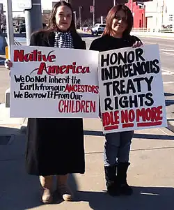 Idle No More is an ongoing protest movement, founded in December 2012 by four women: three First Nations women and one non-Native ally. It is a grassroots movement among the Indigenous peoples in Canada comprising the First Nations, Métis and Inuit peoples and their non-Indigenous supporters in Canada, and to a lesser extent, internationally. It has consisted of a number of political actions worldwide, inspired in part by the liquid diet hunger strike of Attawapiskat Chief Theresa Spence[1] and further coordinated via social media. A reaction to alleged legislative abuses of Indigenous treaty rights by then Prime Minister Stephen Harper and the Conservative federal government, the movement takes particular issue with the omnibus bill Bill C-45.[2][3] The popular movement has included round dances in public places and blockades of rail lines.