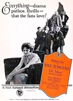 Idle Tongues is a 1924 American silent drama film directed by Lambert Hillyer and produced by Thomas H. Ince, one of his last efforts before his death that year. It starred Percy Marmont and Doris Kenyon and was distributed by First National Pictures.[2][3]