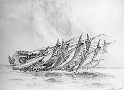 Just a minute or two before 2 PM, Capt. Holmes ordered the crew to furl the main topsail, fore topsail, and fore jib topsail.[40][z] The wind had suddenly become quite strong, however. The yacht was lying over (tilted) strongly to starboard, and the crew could not take in the forestaysail.[26][40] The crew had lowered and clewed the main gaff topsail[43][56] and was taking down the fore jib topsail when the storm struck.[22][43][aa]