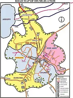 Idumuje Unor is an Igbo town situated in the Aniocha North Local Government Area of Delta State, Nigeria, lying between 6°20'01.4"N and 6°22'06.5"N and between 6°25'01.4"E and 6°27’06.6"E. It is located 5 kilometers from Issele-Uku, the headquarters of Aniocha North and has a growing land area of 16sq km and current estimated population of about 20,000 inhabitants. It is bordered to the west by Onicha-Ugbo, to the North by Idumuje-Ugboko and Ewohinmi in Edo State, to the East by Onicha-Uku and Ugbodu and to the south by Issele-Uku. The name Idumuje in the Esan language could be translated to mean; Idumu - Community/Quarters and Oje - King/Royal. In other words, Idumuje means Royal Quarters or Kings' Quarter. Worthy to note: Another Idumuje named location could be found at present in Benin (in proximity to the Royal Palace of the Oba of Benin). The suffix "Unor" (meaning - home) is an inclusion to the town's name so as to differentiate it from the breakaway community Idumuje -Ugboko; by a man called Nwoko and his supporters some 300 years ago. Ugboko is translated to mean "Ugbo" - Farm & "Oko" - a shortening of the name Nwoko.