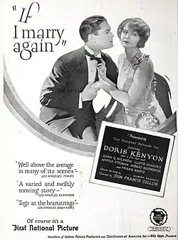 If I Marry Again is a 1925 American silent drama film directed by John Francis Dillon and written by Kenneth B. Clarke. The film stars Doris Kenyon, Lloyd Hughes, Frank Mayo, Hobart Bosworth, Anna Q. Nilsson, and Myrtle Stedman, and was released on February 15, 1925, by First National Pictures.[1][2][3] It was based on a story by the British writer Gilbert Frankau.[4]
