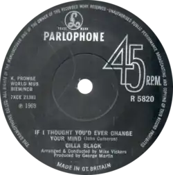 "If I Thought You'd Ever Change Your Mind" was released as a single in the UK on 21 November 1969 through Parlophone Records, backed by "It Feels So Good".[23][25][26][nb 5] A release in the United States followed in December 1969 through DJM Records; for this release, the song was re-titled "If You Should Ever Change Your Mind".[27] In the UK, the single was caught up in the record-buying rush right before Christmas, taking over a month to chart before it entered the Record Retailer chart on 13 December 1969 at a position of 34.[20] It would achieve a peak position of number 20 on 10 January 1970, becoming Black's 13th and penultimate top-20 hit in England.[20] The song dropped out of the chart on 7 February 1970 at a position of 42, having spent 9 weeks on the charts.[20] It also reached number 29 in the chart compiled by New Musical Express on 27 December 1969.[28]
