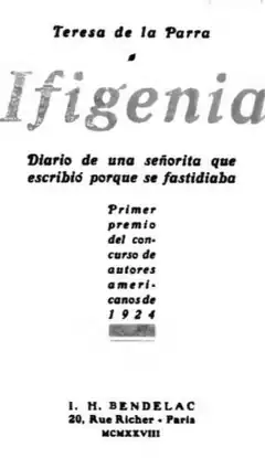 Ifigenia (in English Iphigenia: Diary of a Young Girl Who Wrote Because She Was Bored) is a 1924 Venezuelan novel by Teresa de la Parra. Ifigenia marked a change in Latin American literature. The novel is a feminist critique of Caracan society in the early twentieth century.[1] Strict moral rules are represented by the grandmother in this novel, and the character of Uncle Pancho represents the ambitious personality which was common at the time due to political corruption. Besides being a harsh criticism of society, Ifigenia is a fast-paced work with detailed descriptions. The novel caused serious problems for the author because the Venezuelan dictator Juan Vicente Gómez denied her a grant to publish the book. De la Parra decided to move to Paris. A veiled criticism of the regime of Gomez can be seen in Ifigenia.