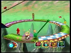 Power-ups, scattered throughout the 100 courses, equip the players with temporary special abilities.[5] Up to four players can participate. Modes of play include Arcade, Mix-up, Time Trial and Battle. There are initially eight characters to choose from, with an additional nine hidden characters that can be unlocked later.