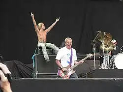Initially playing a raw, primitive style of rock and roll (progressing later towards more experimental and aggressive rock), the Stooges sold few records in their original incarnation and gained a reputation for their confrontational performances, which sometimes involved acts of self-mutilation by Pop.[8] He had a long collaborative relationship and friendship with David Bowie over the course of his career, beginning with the Stooges' album Raw Power in 1973. Both musicians went to West Berlin to wean themselves off their respective drug addictions and Pop began his solo career by collaborating with Bowie on the 1977 albums The Idiot and Lust for Life, Pop usually contributing the lyrics. He was one of the first performers to do a stage-dive and popularized the activity.[9][10] Pop, who traditionally (but not exclusively) performs bare-chested, also performed such stage theatrics as rolling around in broken glass.
