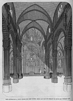 The Iglesia de Nuestra Señora del Buen Suceso, commonly known as Iglesia del Buen Suceso was a church of Madrid that delimited the eastern part of the Puerta del Sol (Madrid).[1] The church comes from a remodeling of the Hospital Real de la Corte (Royal Hospital of the Court) (built in 1483). Was doing functions of church and hospital since 1590. Its lonja was meeting place for several centuries. The church's clock would be important during this period until it was installed one of better performance on the Real Casa de Correos.[2] Its demolition coincided with the Confiscation of Mendizábal that left space for the later expansion that was done for the Puerta del Sol.