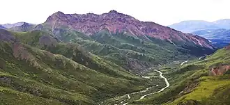 Igloo Mountain is located in the Alaska Range in Denali National Park and Preserve. It is situated 4.93 miles (7.93 km) west of Double Mountain along the west side of Igloo Creek at mile 35 of the Park Road.[2] Precipitation runoff from the mountain drains west into Big Creek and east into Igloo Creek, which are both tributaries of the Teklanika River. Topographic relief is significant as the summit rises 1,800 feet (550 meters) above Igloo Creek in one mile (1.6 km). This mountain was named in association with Igloo Creek; the name was published in 1954 by the U.S. Geological Survey; and the toponym has been officially adopted by the United States Board on Geographic Names.[4]