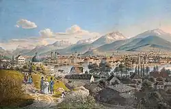 The first mention of Innsbruck dates back to the name Oeni Pontum or Oeni Pons which is Latin for bridge (pons) over the Inn (Oenus), which was an important crossing point over the Inn river. The Counts of Andechs acquired the town in 1180.[5] In 1248 the town passed into the hands of the Counts of Tyrol.[6] The city's arms show a bird's-eye view of the Inn bridge, a design used since 1267. The route over the Brenner Pass was then a major transport and communications link between the north and the south of Europe, and the easiest route across the Alps. It was part of the Via Imperii, a medieval imperial road under special protection of the king. The revenues generated by serving as a transit station on this route enabled the city to flourish.