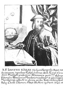 Ferdinand Augustin Hallerstein, his co-operator and successor, called him "one of the most cultivated minds that ever came into these countries".[4] Kögler carried on a brisk scientific correspondence with a number of European scholars, such as Eusebius Amort and T. S. Bayer, the Orientalist, sending Bayer many contributions for his "Museum Sinicum".[5]