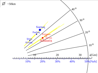 Ijiraq orbits Saturn at an average distance of 11.3 million km in 451 days on an orbit very similar to Kiviuq's.[3] Ijiraq is believed to be in Kozai resonance: its orbit is cyclically reducing the inclination while increasing the eccentricity and vice versa. The orbital argument of pericenter oscillates around 90° with an amplitude of 60°.[8] Like Kiviuq and Thrymr, Ijiraq's orbital elements overlap strongly with Phoebe's, and it is likely to collide with Phoebe in the future.[5]