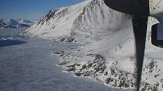 Icelandair STOL aircraft approach Kulusuk Airport on the way from Nerlerit Inaat and Reykjavík flying directly over the southern end of Apusiaajik Island and then over the Ikaasaartik Strait, in an air canyon between the Qalorujoorneq ridge on Kulusuk Island, and the Kangaartik and Iperajivit summits on Apusiaajik Island.[1]