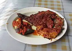 Ikan bakar is usually served with sambal belacan (chili with shrimp paste) or sambal kecap (sliced chilli peppers and shallot in sweet soy sauce) as dipping sauce or condiment and slices of lemon as garnish. The East Indonesian Manado and Maluku ikan bakar usually uses rica-rica,[11] dabu-dabu[12] or colo-colo condiment.[13]