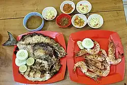 There are many variants of ikan bakar, differ from the recipes of marinate spices, dipping sauces or sambals, to the species of fishes being grilled. Almost all kinds of edible fish and seafood can be made into ikan bakar, the most popular are freshwater gourami, patin and ikan mas, to seafood tongkol or cakalang, bawal, tenggiri, kuwe, baronang, kerapu, kakap merah (red snapper), and pari (stingray).[14] Some of the popular forms of seafood besides fish include sotong (squid), and udang (shrimp).