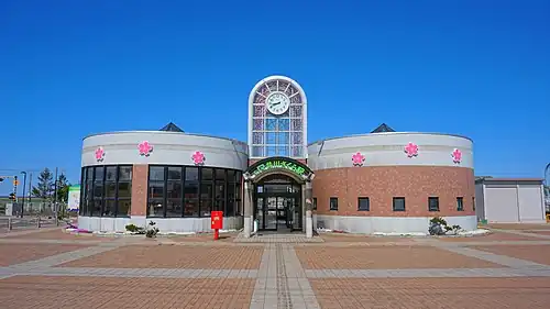 The station consists of two opposed side platform connected to the station building by an underground passageway. The station is staffed. The station building includes a community center, a reading room, and a cafe.