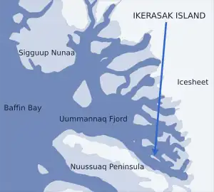 Ikerasak Island (Greenlandic: Ikerasaap qeqertaa) is an island in Avannaata municipality in northwestern Greenland, located in the southeastern part of Uummannaq Fjord, at the mouth of Ikerasak Fjord, its innermost section.[1]