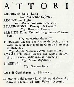 | Bellerofonte, Prince of Corinth | soprano castrato | Ferdinando Mazzanti |