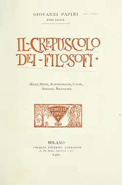 Il crepuscolo dei filosofi (lit. 'The Twilight of the Philosophers') is a 1906 book by the Italian writer Giovanni Papini. It is an evaluation of modern Western philosophy, with special attention to what Papini viewed as errors in the works of Immanuel Kant, Georg Wilhelm Friedrich Hegel, Arthur Schopenhauer, Auguste Comte, Herbert Spencer and Friedrich Nietzsche. Papini here used scepticism and Nietzscheanism to reach a radical form of pragmatism and defend irrational vitalism.[1][2]