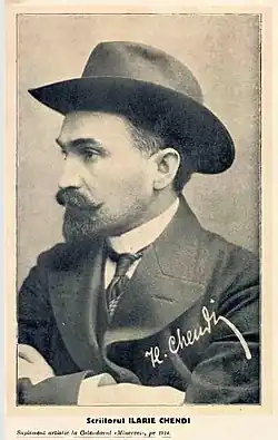 He made his prose-writing debut in 1893, and in 1898 settled in Bucharest, capital of the Romanian Old Kingdom. He published three volumes of critical columns, fragments and impressions over the course of three years (1903, 1904 and 1905), an unprecedented level of activity for a Romanian critic. Further works of impressions and literary biography followed in 1908 and 1911. For a time, he was aligned with the Sămănătorul circle of Nicolae Iorga, but broke with them in 1906. He then founded Viața literară, later Viața literară și artistică, a magazine that appeared over the course of the year 1907 and that he wrote almost in its entirety, sometimes under pseudonyms. Although still influenced by his former colleagues' ideas—Zigu Ornea labeled the publication "a dissident sămănătorist magazine"—he pursued a somewhat independent course, engaging in bitterly ironic polemics with Iorga. Chendi was among the founders of the Romanian Writers' Society. His intellectual ascendancy was ongoing when he committed suicide in 1913.[4]