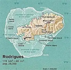 Île aux Cocos (French pronunciation: [il o koko]; 'Cocos Island') is a small uninhabited island lying four kilometres west of Rodrigues in the Indian Ocean. It is a nature reserve known for its seabird colonies. The island is not accessible to the public except via guided visits to the island. The southern tip delineated by wooden posts is closed to visitors to protect the bird population.