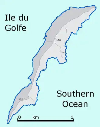 The Ile du Golfe is a limestone island located close to the south-western coast of Tasmania, Australia. The long, narrow dolphin-shaped 68-hectare (0.26 sq mi) island is part of the Maatsuyker Islands Group, and comprises part of the Southwest National Park and the Tasmanian Wilderness World Heritage Site.[1][2]