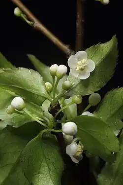 Flowers are white and arranged in axillary umbels with slender pedicels, dioecy. Male flower: 2 to 5 flowers each inflorescence and measure approximately 2.5 to 3 mm in diameter. They are glabrous with 4 or 5 suborbicular petals, margin erose, corolla rotate, base slightly connate; stamens ca. 3/4 as long as petals, anthers oblong and ca. 1 mm. Female flower: 4 to 6 flowers each inflorescence, glabrous, ca. 3 mm in diameter; flowers 4-6; calyx deeply 4 to 6 lobed; corolla rotate, petals suborbicular, basal slightly connate; staminodes ca. 1 mm, sterile anthers sagittate; ovary ovoid, ca. 1.5 mm in diameter, style present, stigma thickly discoid.