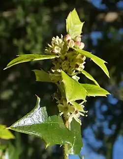 Ilex pernyi is a species in the Ilex (holly) genus and the family Aquifoliaceae. This evergreen shrub or small tree occurs in Mongolia and the south-west of China, specifically in Anhui, Gansu, and Shaanxi.[1] The leaves are diamond-shaped with sharply toothed margins, opposite on the many branches. The small flowers are yellow, and berries on the female plants are red.