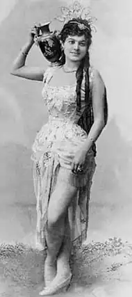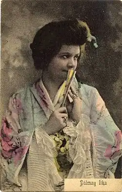 Pálmay began her stage career in Hungary (including Kassa, Budapest and Kolozsvár) by 1880 and played about two dozen roles in the 1880s, including Serpolette in Les Cloches de Corneville[3] In the early 1890s, she performed at the Theater an der Wien in Vienna, where she created leading roles in Carl Zeller's Der Vogelhändler (1891) and Johann Strauss II's Fürstin Ninetta (1893).[4] Soon, she was playing in Prague and the Unter den Linden Theater in Berlin. There, in 1893, she was cast in a German production of The Mikado to play the tenor hero, Nanki-Poo, in drag, and Sullivan unsuccessfully tried to stop the performances.[5] Later, Pálmay was surprised to find out that no woman had ever appeared on stage at the Savoy Theatre dressed as a man.[6]