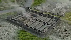 The first fort at Ilkley was founded by Agricola around 80 AD and was largely constructed of wood,[3] but this was later abandoned in the 120s.[1] A second fort was erected around 161 AD which survived for 30 years, before being burnt down,[3] perhaps during a documented rebellion by the inhabitants of northern Britain.[1] It was immediately replaced by a stone fort which survived until the end of the Roman period.[3] The fort was abandoned in the late 4th or early 5th century.[3]