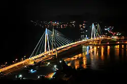 In 2008, a dense array of sensors was deployed on the Jindo Bridge in South Korea and was the first dense deployment of a wireless sensor network on a cable-stayed bridge.[4] This new bridge monitoring system is fully autonomous, and sends out an e-mail when a problem arises. The system wakes up for a few minutes at a time to collect, analyze, and send data, in order to conserve battery power.[5]