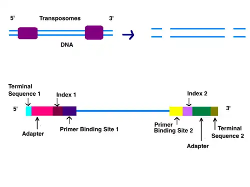 After the DNA is purified from a genomic sample or cDNA is generated, it needs to be converted into library of fragments, genomic library, that can then be sequenced on the instrument. This typically involves two key steps: DNA fragmentation, and end repair & adapter ligation. There are two ways a genomic library can be fragmented: sonication and tagmentation. With tagmentation, modified transposases randomly cut the DNA into sizes between 50 and 500 bp fragments and add adaptors simultaneously.[6] A genetic library can also be generated by using sonication to fragment genomic DNA into similar sizes using ultrasonic sound waves. Specialized adapters are then ligated to the right and left ends of the fragments using T7 DNA Polymerase and T4 DNA ligase. Strands that fail to have adapters ligated are washed away.[7]