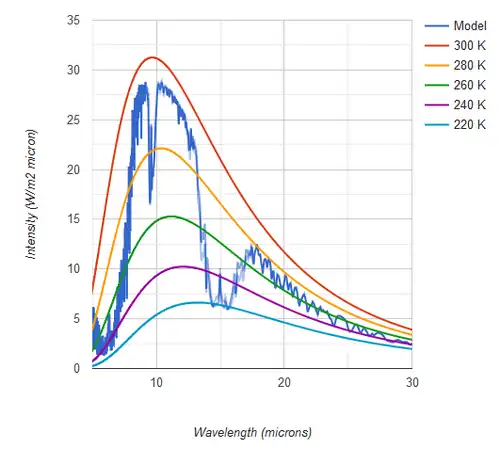 In most of the electromagnetic spectrum, atmospheric carbon dioxide either blocks the radiation emitted from the ground almost completely, or is almost transparent, so that increasing the amount of carbon dioxide in the atmosphere, e.g. doubling the amount, will have negligible effects. However, in some narrow parts of the spectrum this is not so; doubling the amount of atmospheric carbon dioxide will make Earth's atmosphere relatively opaque to in these wavelengths, which would result in Earth emitting light in these wavelengths from the upper layers of the atmosphere, rather from lower layers or from the ground. Since the upper layers are colder, the amount emitted would be lower, leading to warming of Earth until the reduction in emission is compensated by the rise in temperature.[1]
