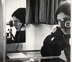 Her move from Frankfurt to the burgeoning avant-garde and surrealist scene in Paris marked the start of the most notable period of her career.[4] She produced images in the fields of photojournalism, architectural photography, advertising and fashion, and her work was published in magazines such as Le Monde Illustre, Harper's Bazaar, and Vogue.[1] After initially living in the Hotel Londres on Rue Bonaparte, she moved to Avenue de Maine, 146 in 1931. In the same year, Bing's work was exhibited in both France and Germany.[3] Her rapid success as a photographer and her position as the only professional in Paris to use an advanced Leica camera earned her the title "Queen of the Leica"[5] from the critic and photographer Emmanuel Sougez, whom she met in 1931. In 1933, Bing left Avenue de Maine and moved to Rue de Varenne, No. 8. With the pianist and music teacher Konrad Wolff, who lived in the same house, she was initially only known through his piano playing, which could be heard through the courtyard. A little later they would get to know each other personally and become a couple.