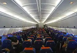 The Il-96-400 is similar to the Il-96M, but features Russian avionics and engines. It is powered by four Aviadvigatel PS-90A1 turbofans and can carry up to 436 passengers. Typical two-class configuration will have 386 passengers. Range with 315 passengers in a three-class configuration is about 10,000 km.[17] A special version, dubbed Il-96-400VT, was reported on Friday 19 March 2010 by the Wall Street Journal to bid on the US$40 billion Air Force Tanker Program contract.[18] In February 2013, Cubana signed a deal for the order of three 350-seater Ilyushin Il-96-400s.[19]