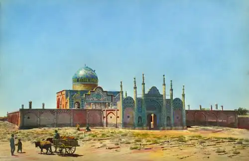 The tomb is reminiscent of a generous palace complex with its own walled garden, plant rows, small Iwanen, niches, grave stones and precious blue and cream-colored tile decorations. The facade of the main gate is of six ornamental minarets surmounted. Is the main gate by steps, there is a large courtyard opens. Directly behind the gate is a pavilion-like, octagonal fountain house.[2]