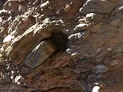 - A-axis imbrication where the long axes of the clasts are oriented parallel to the flow direction. This fabric is characteristic of clasts carried in suspension and this is only preserved in the case of a fast-waning flow in which the clasts are deposited without any significant rolling. This fabric is typical of conglomerates at the base of turbidite beds but is also occasionally observed in alluvial fan deposits reworked by flash floods [3]