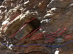 In sedimentology, imbrication is a primary depositional fabric consisting of a preferred orientation of clasts such that they overlap one another in a consistent fashion, rather like a run of toppled dominoes. Imbrication is observed in conglomerates and in some volcaniclastic deposits.[1][2]